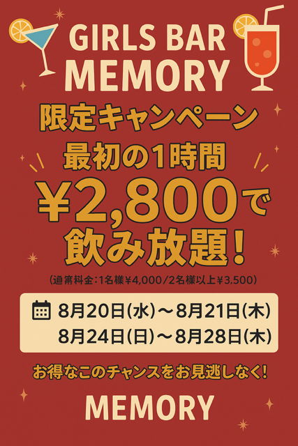 期間限定 最初の1時間¥2800 飲み放題 8月24日(日)~28日(木)